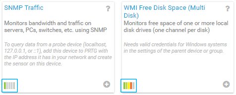 i_round_bluePRTG suggests sensors for the selected device. This recommendation is automatically calculated based on the current user's sensor usage. It shows the ten most commonly used sensors if there are already enough sensors for the recommendation to use.