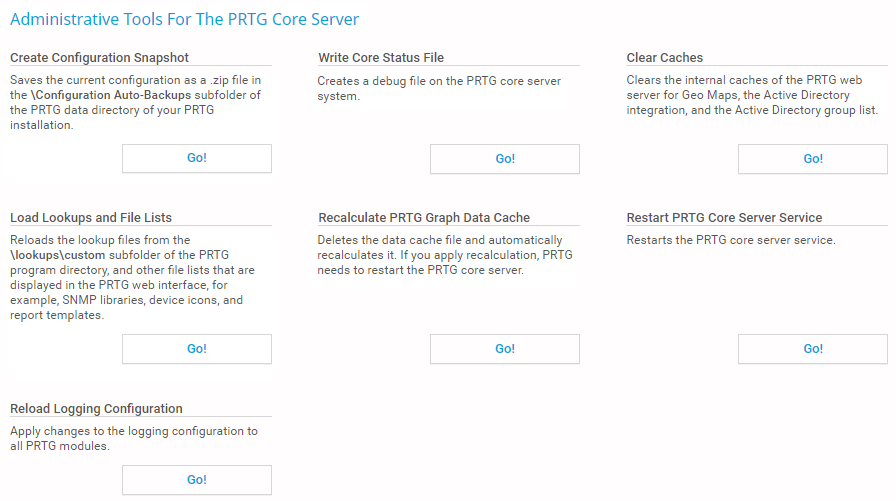 i_round_redIf you restart the PRTG core server service, all users of the PRTG web interface, the PRTG app for desktop, or the PRTG apps for iOS or Android are disconnected. Clicking Go! immediately restarts the PRTG core server service.