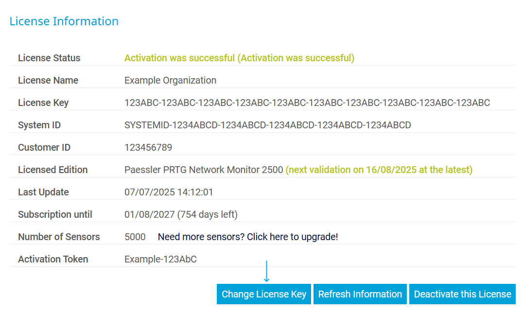 Because PRTG already asks for a license key during installation, you usually do not need to manually enter one afterward. However, there are still scenarios where you need to change your license key and activate the respective license. For example, you must provide the subscription license key of your commercial edition if you upgrade from a freeware edition or trial edition, or if you want to upgrade your subscription license to one with a higher sensor count.