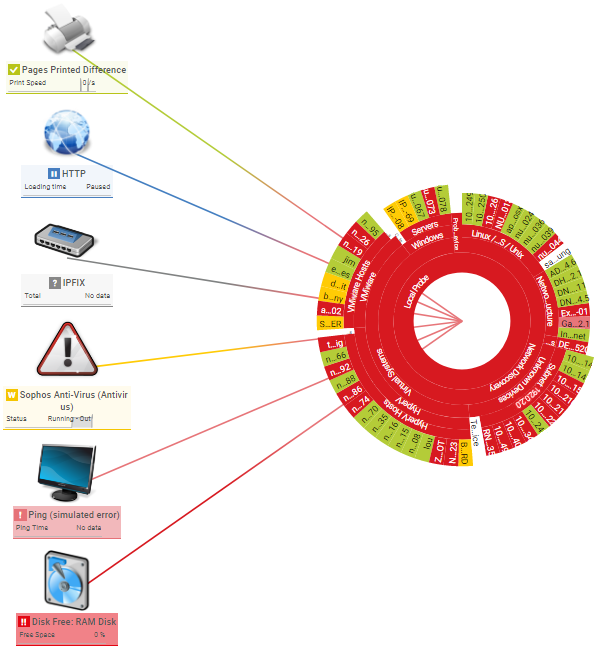 i_round_blueThe map designer dynamically colors the lines between items depending on the status of the linked objects. A line is red, for example, if the linked objects both show the Down status. Connection lines can also have two colors. For example, if one linked object shows the Down status and the second linked object shows the Warning status, one half of the line is red and the other half is yellow.