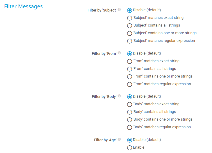 • 'Body' matches regular expression: Filter emails whose body matches the defined regular expression.