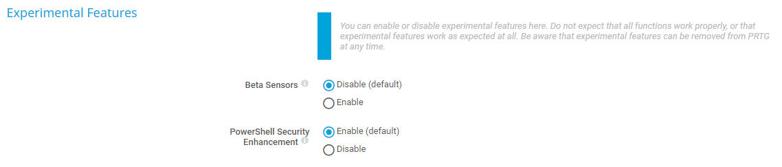 i_round_redThe operating methods of the experimental features might change at any time. Do not expect that all functions work properly, or that the experimental features work as expected at all. Be aware that Paessler might remove these features at any time.
