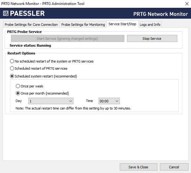 No scheduled system or service restart: Do not automatically perform a scheduled restart of services. We recommend that you manually restart the PRTG core server system every few weeks. You can initiate a restart of the PRTG probe service in the Administrative Tools in the PRTG web interface.