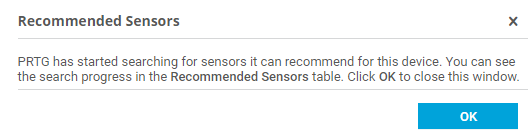 With the Recommended Sensors Detection feature, PRTG can explore any device and check which sensors you have already created. If it finds useful sensors that you have not created yet, you see a list of recommended sensors for your device.