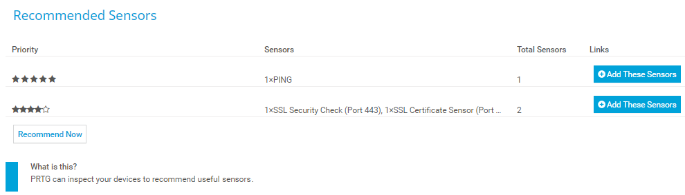 i_round_blueIf you want to add all suggested sensors regardless of their priority, click every Add These Sensors button in the Recommended Sensors table. If you want to add only some of the sensors of a certain priority, click Add These Sensors, then delete or pause the sensors you do not need afterward.