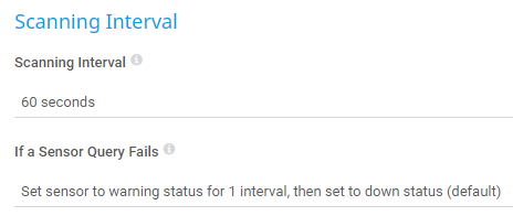 Select the number of scanning intervals that the sensor has time to reach and to check a device again if a sensor scanning fails. Depending on the option that you select, the sensor can try to reach and to check a device again several times before the sensor shows the Downstatus. This can avoid false alarms if the target device only has temporary issues. For previous scanning intervals with failed requests, the sensor shows the Warning status.
