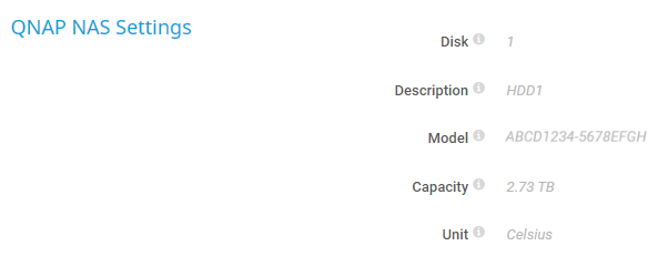 The SNMP QNAP Physical Disk sensor monitors a physical disk in a Quality Network Appliance Provider (QNAP) network-attached storage (NAS) via the Simple Network Management Protocol (SNMP).