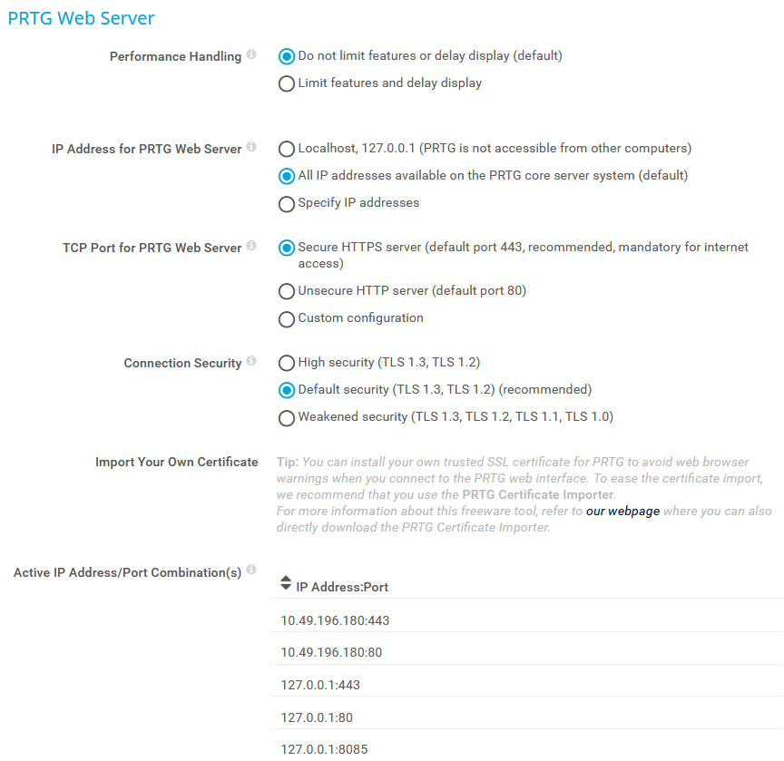 Specify how the PRTG web server accepts incoming web page requests: