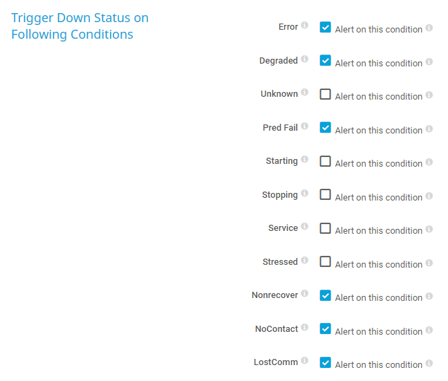 Set the sensor to the Down status if the share returns a predicted fail status. This indicates that an element works properly but predicts a failure (for example, a SMART-enabled hard drive). A share in this status is still operational.