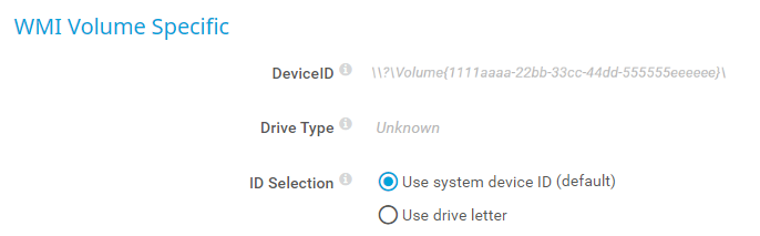 • Use system device ID (default): Use the system device ID. This is usually the best option for this sensor because the device ID does not change when the volume is renamed.